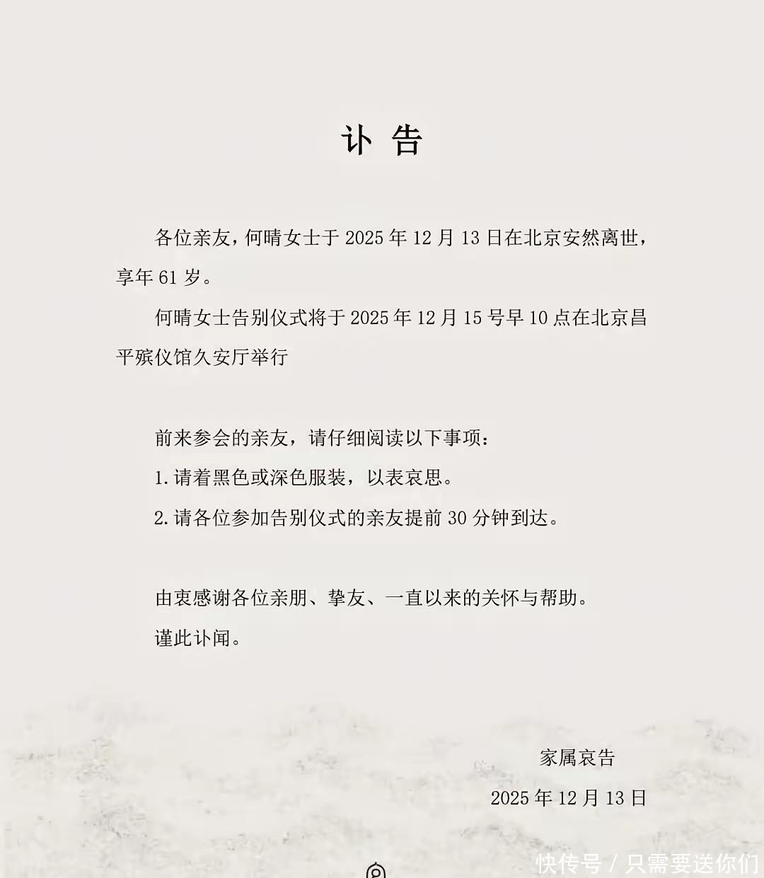 12日,何晴家属当天发布讣告,证实她离世的消息,享岁。好友常戎得知后特别难受,对好朋友的去世表示深深的哀悼。